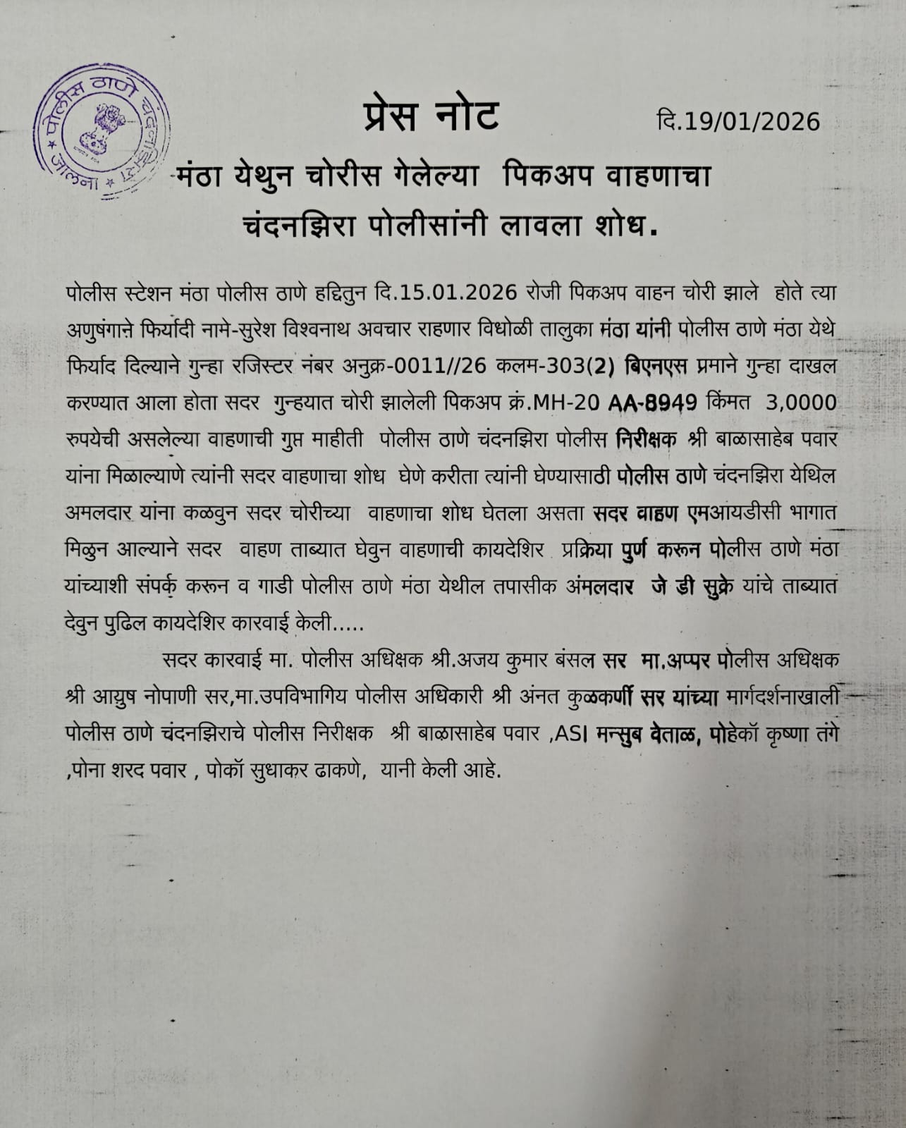 मंठा येथुन चोरीस गेलेल्या पिकअप वाहनाचा चंदनझिरा पोलिसांनी लावला शोध.