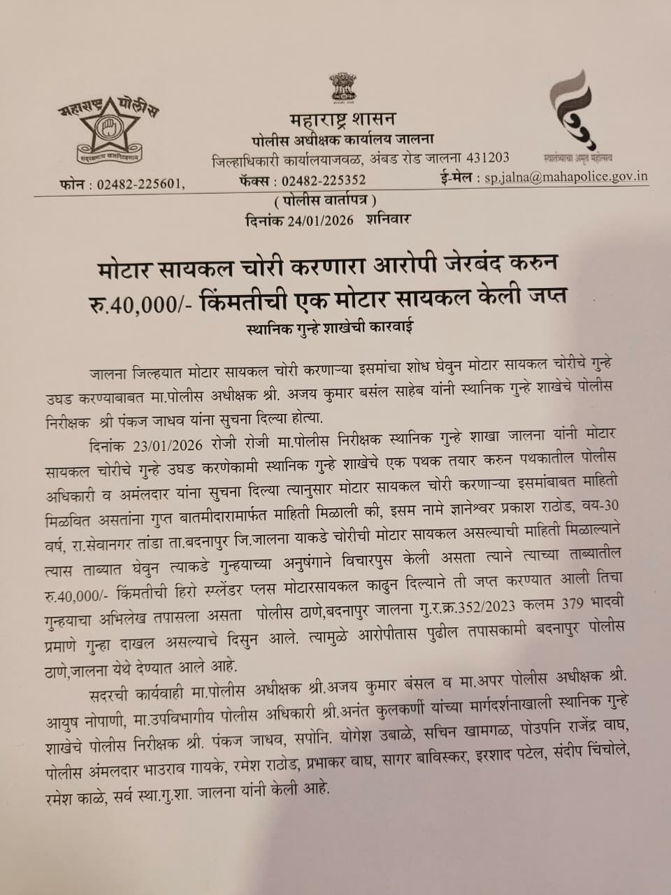 मोटार सायकल चोरी करणारा आरोपी जेरबंद करून रु. 40,000/- किंमतीची एक मोटार सायकल केली जप्त.