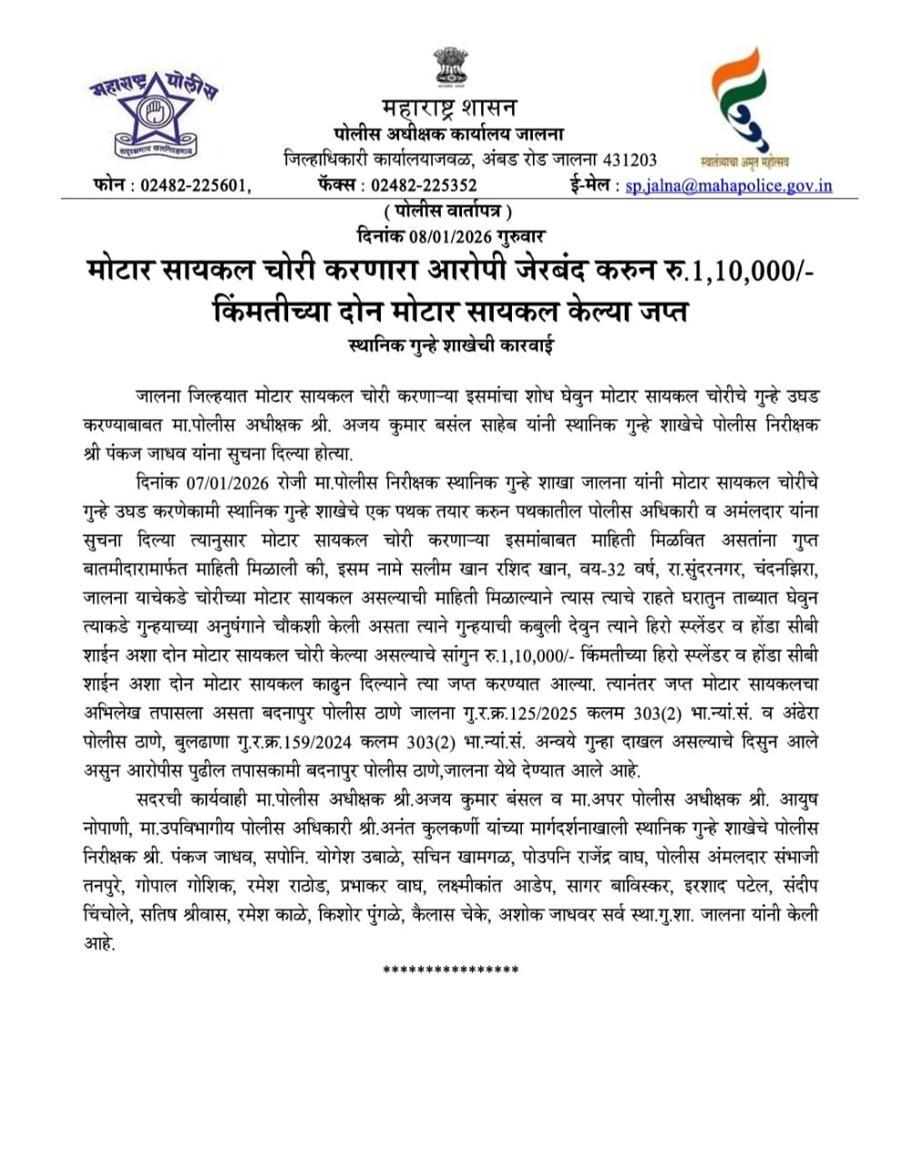 मोटार सायकल चोरी करणारा आरोपी जेरबंद करून रु. 1,10,000/- किंमतीच्या दोन मोटार सायकल केल्या जप्त.