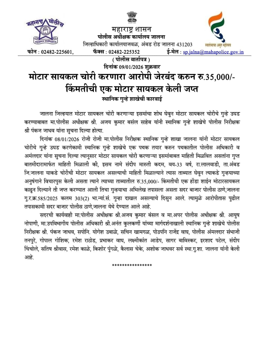 मोटार सायकल चोरी करणारा आरोपी जेरबंद करून रु.35,000/- किंमतीची एक मोटार सायकल केली जप्त.